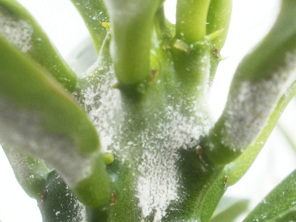 Mealy bugs are different, but thankfully still manageable. They are tiny bugs that camp out on leaves and stems, covered in a thin white substance. They like to hang out and eat new layers of plant tissue as they grow. Needless to say, that’s not at all good for the plant and can lead to unhealthy, oddly shaped leaves and stems.