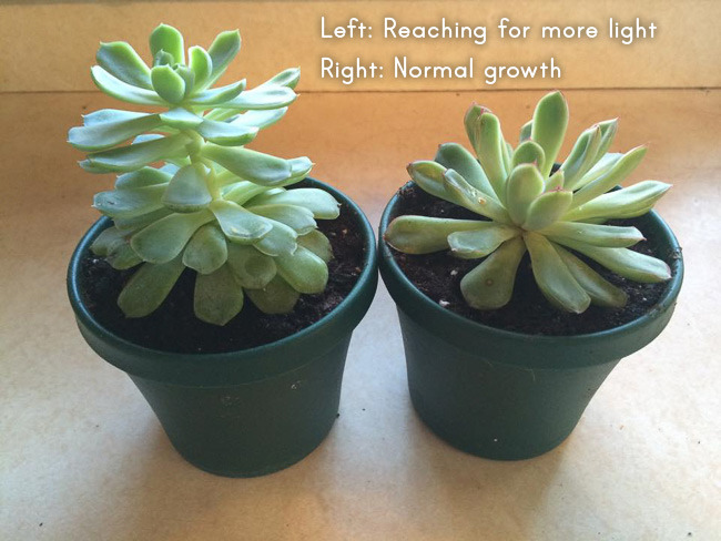 Color Loss, Leaning, Stretching – When not getting enough sun, a succulent’s leaves will try to reach more favourable exposure by leaning. They will also try to stretch out so that they have more surface area to capture light with.