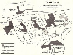 At sixty-seven acres of land, ranging from jutting rock formations and historic ruins to meadows and a large wooded area, the Cedar Hollow preserve is a relatively recent acquisition by the Open Land Conservancy. Other notable geography are the wetlands and flood plain near Valley Creek.